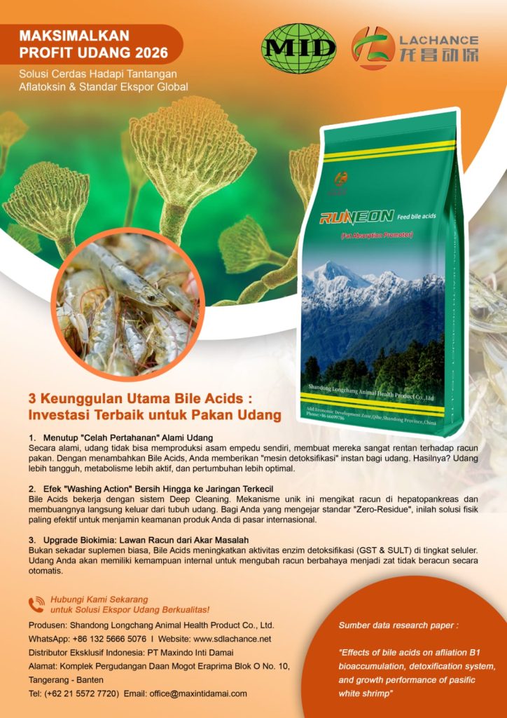 Memasuki tahun 2026, dunia akuakultur semakin kompetitif dengan standar keamanan pangan yang sangat ketat. Sebagai pemain kunci di industri udang, Indonesia menghadapi musuh tersembunyi: Aflatoksin B1 (AFB1). Racun ini tidak hanya merusak organ dalam udang secara perlahan, tetapi juga berisiko tinggi menyebabkan penolakan ekspor akibat akumulasi residu di jaringan otot. Kini hadir terobosan ilmiah untuk masa depan tambak Anda: Asam Empedu (Bile Acids) molekul alami yang menjadi “perisai” utama untuk memastikan udang Anda berkualitas premium dan bebas residu.